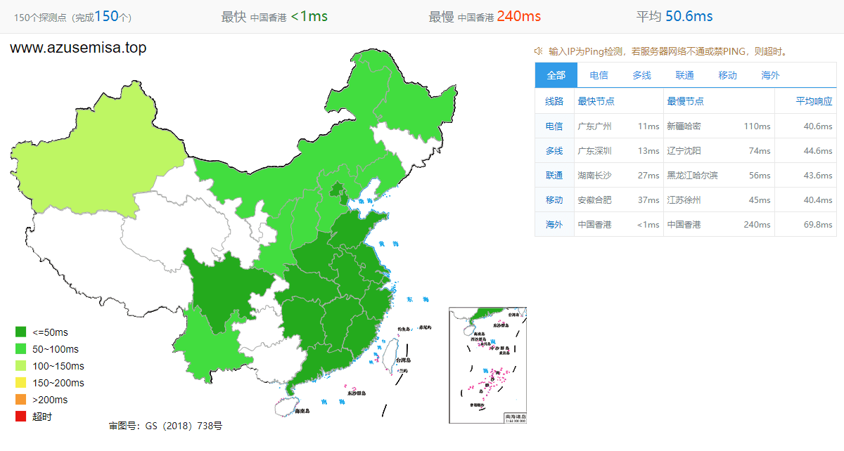 重点是速度,换上 VPS 之后我自己 Ping 了几次,平均时间都在 50ms 左右,然后用站长工具测了个速,个人感觉确实挺不错的,客服诚不欺我。