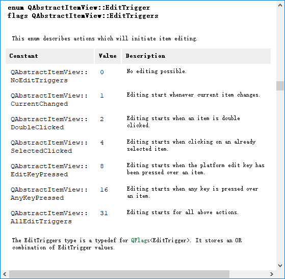 使用setEditTriggers()方法设置视图的编辑规则,可传入以下值。